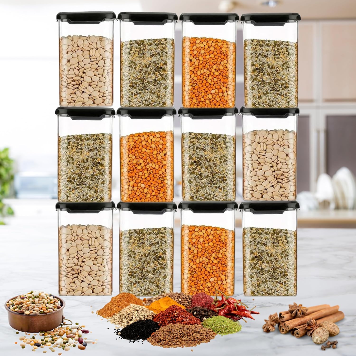 TRENDORA Air-Tight BPA-Free Plastic Storage Container Set, Kitchen Organizer for Pantry & Kitchen Storage, Multi-Purpose Food Storage Jars, Unbreakable Design (12 Pack-1100ML), Transparent